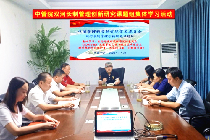 2020年7月20日下午,中国管理科学研究院学术委员会“双河长制管理创新研究课题组”秘书处,在长沙橘子洲头举行集体学习活动,针对2020年7月19日生态环境部党组书记孙金龙在《光明日报》发表的署名文章《做习近平生态文明思想的坚定信仰者、忠实践行者、不懈奋斗者》,组织了集体学习和讨论。