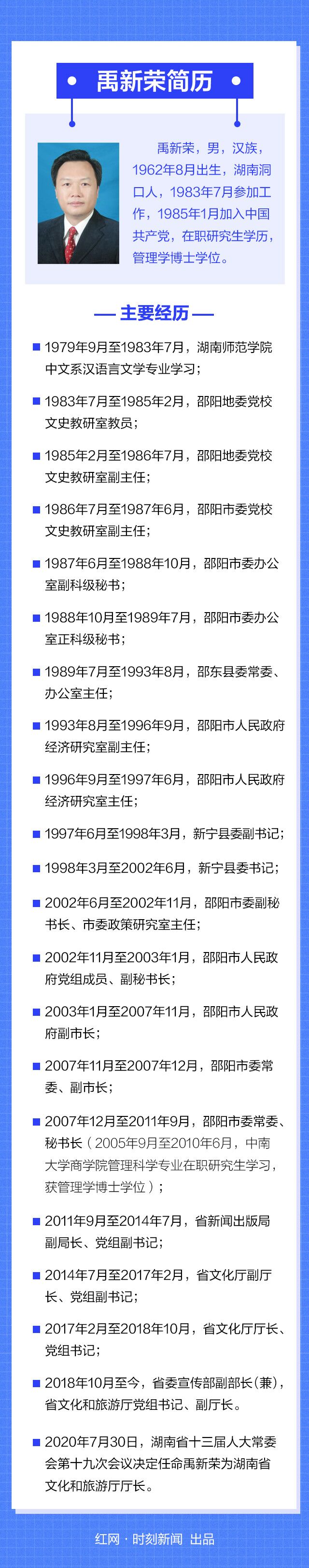 禹新荣任湖南省文化和旅游厅厅长 红网时刻7月30日讯(记者 吴公然 廖洁) 7月30日下午,湖南省十三届人大常委会第十九次会议经过表决,决定任命:禹新荣为湖南省文化和旅游厅厅长。决定免去:陈献春的湖南省文化和旅游厅厅长职务。 【编者按】此前,禹新荣已经是湖南省委宣传部副部长、湖南省文化和旅游厅党组书记。 中部文化网(zhongbuwenhua.com)