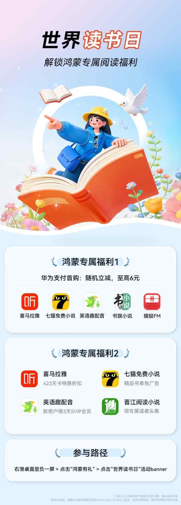 4月25日前,鸿蒙用户可右滑桌面至负一屏,点击“鸿蒙有礼”,点击“世界读书日”活动banner,喜马拉雅、七猫免费小说等应用的鸿蒙专属福利等你来领。读书日不只有书香,还有鸿蒙陪你“阅”见美好。