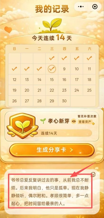 作为国家文化数字化战略的落地探索,“一分钟孝心”小程序立足当代家庭生活节奏,以每日一分钟签到为核心入口,引导用户通过“联系父母、牵挂父母”完成简单打卡。签到后可随机获取孝文化暖心小故事,在潜移默化中传递孝亲理念;同时,系统根据连续打卡记录,逐步解锁孝心新芽、嫩叶、繁花、硕果四大成长等级,最终可获得专属孝文化数字藏品,实现“孝心可记录、成长可看见、文化可收藏”。