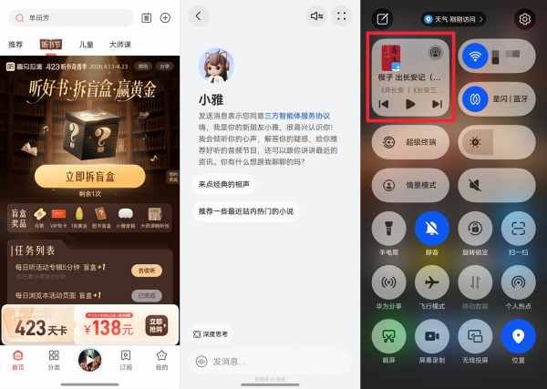 • 小艺推荐,懂你所听:喜马拉雅的小艺会根据你的喜好,主动推荐“423听书奇遇季”的优质专辑。小雅智能体与小艺的深度协同,让你从选书到听完,只需自然对话。
